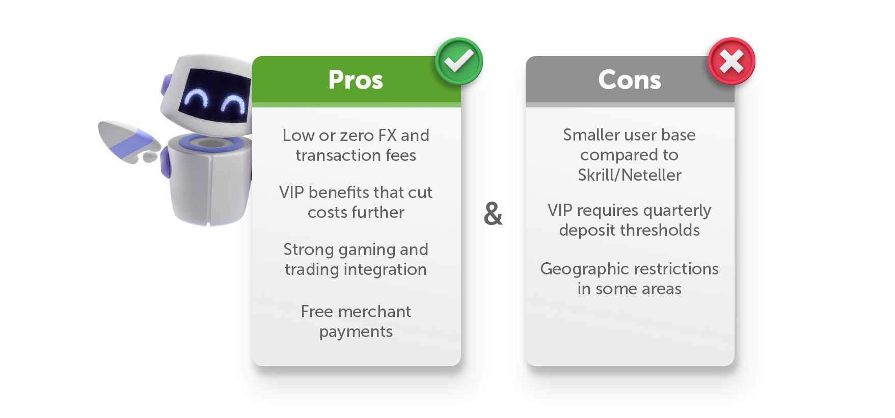 LuxonPay is a newer e-wallet designed with simplicity and low costs in mind, making it especially popular in the gaming and trading space. Free deposits, zero-fee merchant payments, and reduced FX charges at VIP levels make it very competitive.