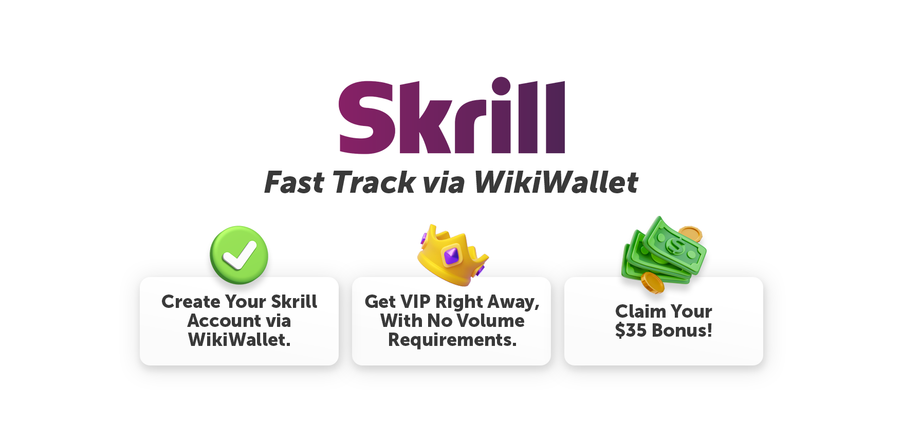Open your Skrill account through Wikiwallet today, start instantly as a Silver VIP, and claim your $35 bonus!